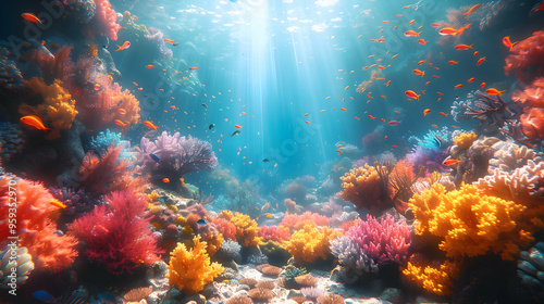 Vibrant Underwater Coral Reef with Fish and Sunbeams - Realistic Image