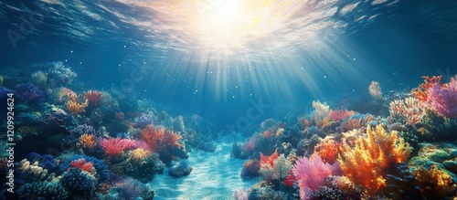 Vibrant Underwater Coral Reef with Sunlight Streaming Through Crystal Clear Ocean Water Creating a Stunning Marine Landscape