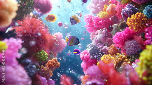 vibrant underwater scene filled with colorful coral reefs and tropical fish, showcasing stunning array of marine life in serene environment