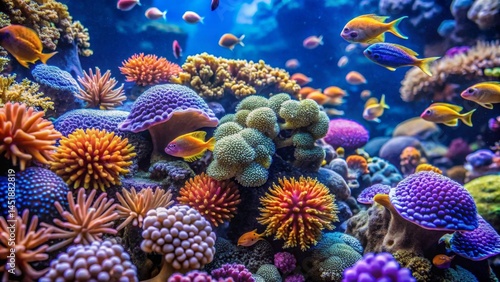 Vibrant underwater scene showcasing a diverse array of colorful coral formations and tropical fish swimming amidst a breathtaking ocean backdrop