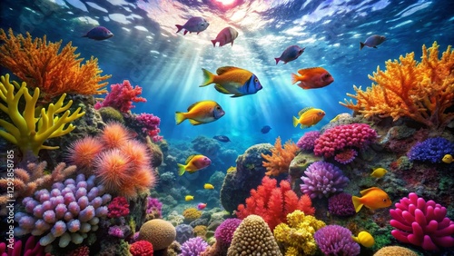 Vibrant Underwater Scene Showcasing a Thriving Coral Reef Ecosystem with a Diverse Array of Colorful Fish Species