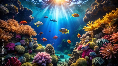 underwater, coral, fish, sea, ocean, marin, aquatic, reef, sunlight, tropical, ecosystem, biodiversity, nature, scenic, wildlife, underwater photography, colourful, marine animal, serene, tranquil, blue water, vibrant, habitat, ocean life, organism, deep sea, swimming, school of fish, bright, exploration, adventure, relaxing, natural beauty, environmental, shallow water, captivating, seascape