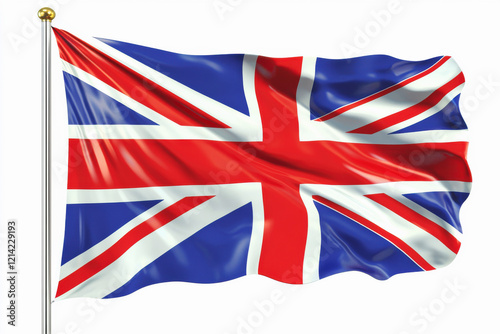 Vibrant Union Jack flag of the United Kingdom displayed upright with glossy texture on a white background