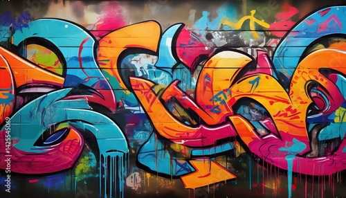 Vibrant Urban Graffiti A Colorful Symphony of Artistry and Expression Layered Over a Timeworn Concrete Backdrop, Captured in the Early Hours of an Energized Cityscape.