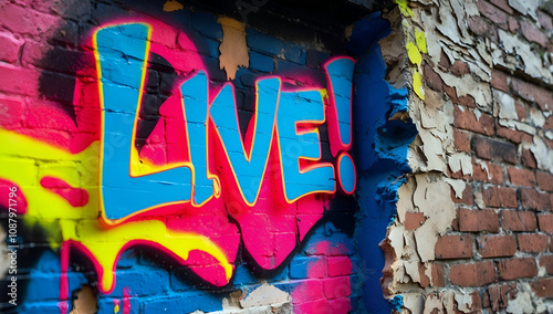 Vibrant Urban Graffiti Featuring Bold Neon Text Saying Live Painted On A Weathered Brick Wall With Peeling Layers Of Paint