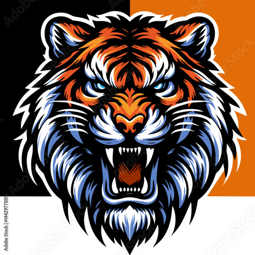 Vibrant vector illustration of a roaring tiger head with sharp details and bold colors. Perfect for logos, sports emblems, tattoos, and fierce animal-themed designs.