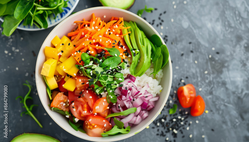 Vibrant vegetable salad bowl with fresh avocado, tomato, carrot, mango, and onion, garnished with sesame seeds on grey background.