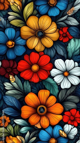 vibrant vertical wallpaper showcasing a floral pattern with red, blue, yellow, and white flowers surrounded by detailed leaves