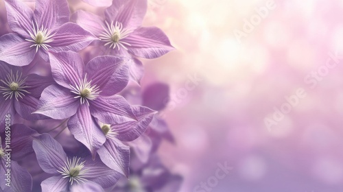 Vibrant violet clematis flowers in bloom with a soft pastel background creating a serene and beautiful floral scene