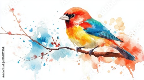 Vibrant Watercolor Bird Perched on Branch with Colorful Background