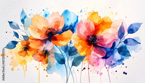 flower, watercolor, floral, painting, art, illustration, abstract, blue, orange, blossom, bouquet, nature, spring, summer, design, drawing, artistic, vibrant, colourful, background, isolated, white, plant, leaf, beautiful, decoration, invitation, card, wedding, greeting, modern, creative, hand-drawn, vignetting, ink, splash, splatter, texture, elegant, romantic, bloom, botany, flora, garden, fresh, delicate, yellow, pink