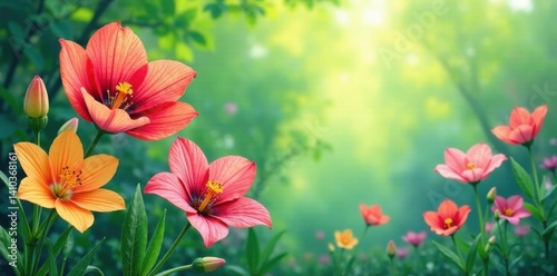 Vibrant watercolor flowers in a lush green setting , foliage, blooming, nature