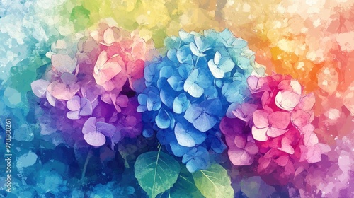 Vibrant Watercolor Hydrangea Flowers in Bloom with Multicolored Background