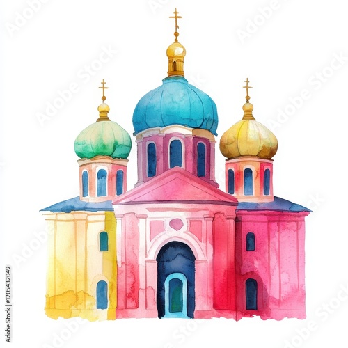 Vibrant Watercolor Painting of a Colorful European Church with Domes