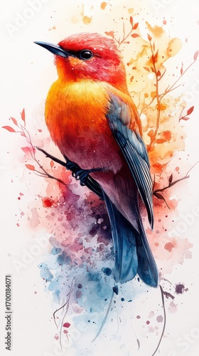bird, watercolor, painting, art, avian, colourful, vibrant, plumage, tree branch, nature, wildlife, animal, exotic, tropical, bright, red, orange, yellow, blue, feather, wing, beak, artwork, illustration, design, image, graphic, digital, pretty, beauty, fauna, creature, detail, delicate, elegant, miniature, small, summer, spring, autumn, winter