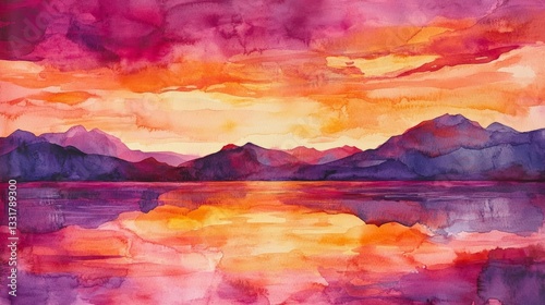 Vibrant watercolor sunset with mountain silhouettes reflected in tranquil lake