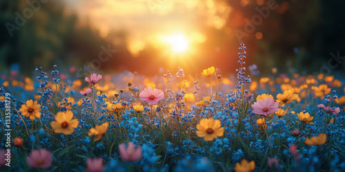 Vibrant Wildflower Meadow at Sunset with Yellow Pink and Blue Blooms a Warm Golden Light Painting Rural Landscape Beauty