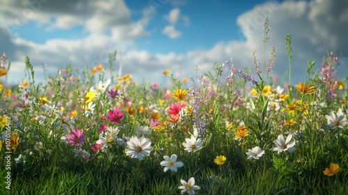 wildflower, meadow, spring, nature, blooming, colourful, flower, sunny, blue, sky, greenery, flora, landscape, field, grass, flower petals, vibrant, pollen, fresh, air, scenic, beauty, calmness, sunlight, seasonal, bloom, ecosystem, rural, environment, countryside, floral, summer, sunshine, natural, habitat, quiet, peaceful, photosynthesis, pollination, wildlife, biodiversity, serene, daydream, harmony