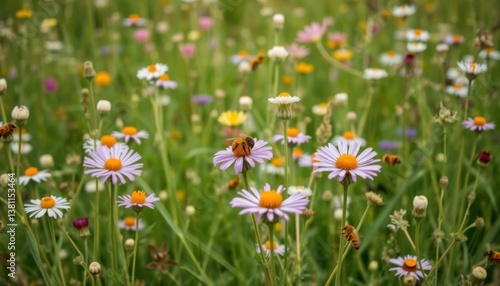Vibrant Wildflower Meadow with Busy Honeybees Pollinating