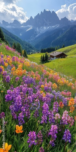 Vibrant wildflowers bloom in a mountainous landscape during springtime in the Dolomite region