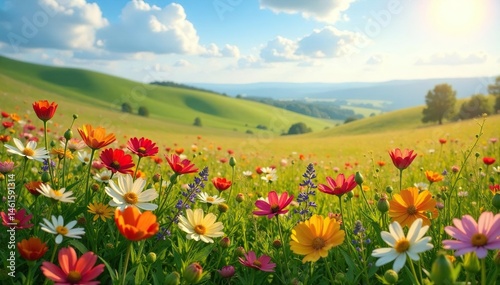 Vibrant wildflowers bloom in a sun-drenched field, rolling hills backdrop , rural, field, daytime