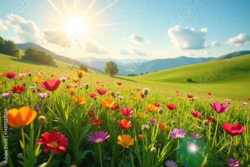 Vibrant wildflowers bloom in a sun-drenched meadow, rolling hills backdrop , summer, golden, landscape