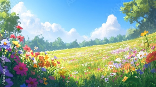 Vibrant wildflowers bloom in a sunny meadow landscape