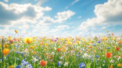 flower, field, meadow, summer, bloom, wildflower, green, grass, blue, sky, white, cloud, sunny, bright, colourful, yellow, orange, red, purple, nature, landscape, floral, beautiful, vibrant, fresh, lush, delicate, beauty, natural, botany, garden, blossom, sunshine, day, season, springtime, outdoors, light, joy, life, growth