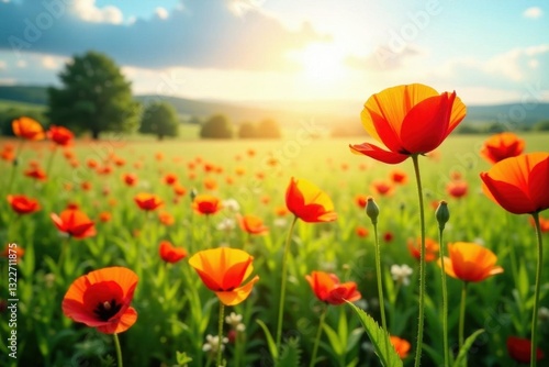 Vibrant wildflowers, poppies ablaze in sun-drenched meadow , spring, image