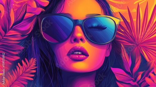 woman, sunglasses, tropical, leaf, art, vibrant, colours, pink, purple, orange, red, design, illustration, graphic, style, fashion, beauty, summer, heat, sun, bright, bold, neon, retro, vintage, modern, abstract, digital, artwork, portrait, face, eye, hair, lip, expression, mood, feeling, aesthetic, energy, carefree, relaxed