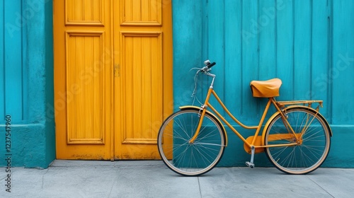 Vibrant Yellow Bicycle Leaned Against a Teal Wall and Yellow Door