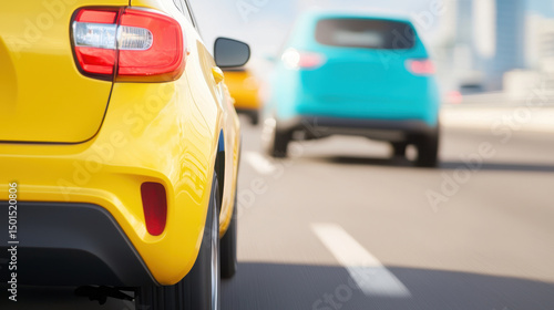 Vibrant yellow car drives on busy highway, showcasing dynamic urban scene with blurred vehicles in background