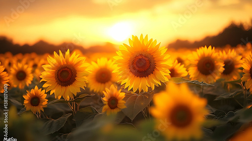 Vibrant Yellow Sunflowers in a Field at Sunset