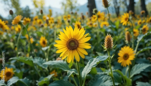 sunflower, flower, bloom, nature, field, bright, yellow, garden, landscape, outdoors, sunlight, flora, beauty, summer, growth, seasonal, countryside, agriculture, peaceful, vibrant, botanical, natural, picturesque, closeup, aesthetic, floral, harmony, freshness, calmness, rural, scenic, detail, timberland, mountain, plant, season, sunshine, flowerbed, lush, greenery, blossom, enjoyment, environment