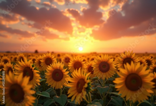 vibrant yellow sunflowers populate field under dramatic sky bold colors textured showcasing natural beauty illumination, clouds, landscape, nature