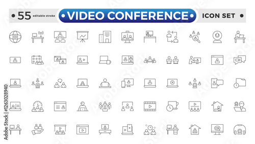 Video Conference set outline icon. Live webinar icons for web and mobile app. Containing conference, business meeting, classroom, team, interview, conference, work. Editable stroke outline icon.