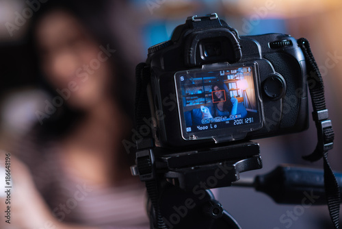 Video recording. Close up of camera screen showing the recording video with a beauty blogger