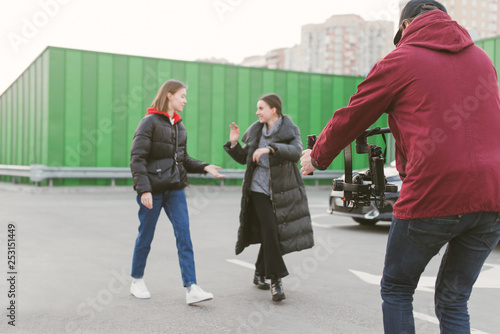 Videographer takes video to the camera with a stabilizer, two girls walk along the street and talk. Cameraman shoots video for bloggers with a professional camera. Creating video. Backstage