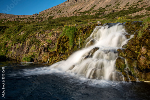 Vie of one of seven of the waterfalls at Dynjandi Waterfalls rushing down the cliffs on the Arnarfjörður in the Westfjords Region of Iceland; Arnarfjordur, Westfjords, Iceland