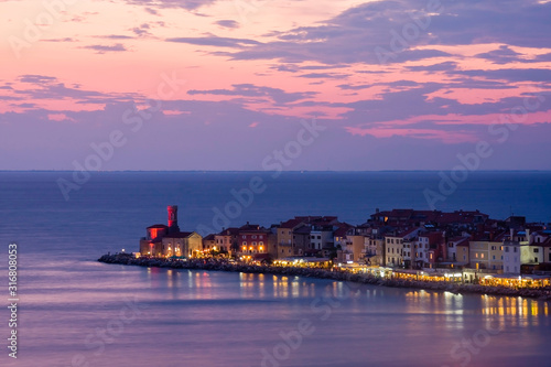 view, roof, town, piran, slovenia, europa, blue, church, city landscape, coastal, day, daytime, entrance, famous, ground, harbor, historic, history, house, karst, landmark, lighthouse, little, maritime, mediaeval, navigation, nobody, ocean, old, orientation, outdoors, outside, panorama, port, red, region, sea, shipping, shot, small, statistical, street, summer
