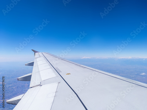 aerial, aeroplane, plane, view, wing, horizon, skyline, flight, sky, fly, cloud, sunny, clear, blue, up high, high, aircraft, aviation, jet, porthole, window, travel, tour tourism, holiday, vacation, transportation, transport, japan, mountain, peak, fuji, mount, nature