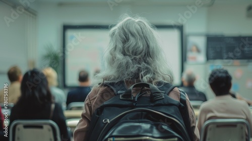 view from behind, a elderly woman with long hair carrying her black backpack in front of some people sitting on chairs watching the whiteboard at school