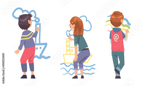 View from behind of cute children painting on wall with crayons cartoon vector illustration