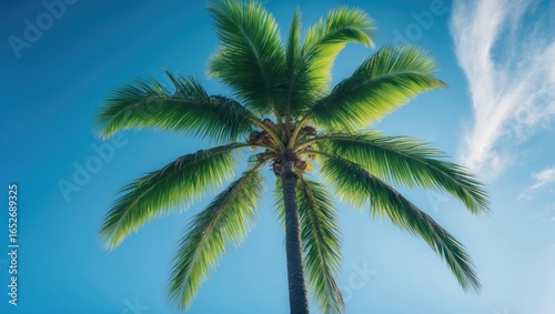View from below of a majestic palm tree with vivid green foliage set against a bright sky, capturing the essence of island life.