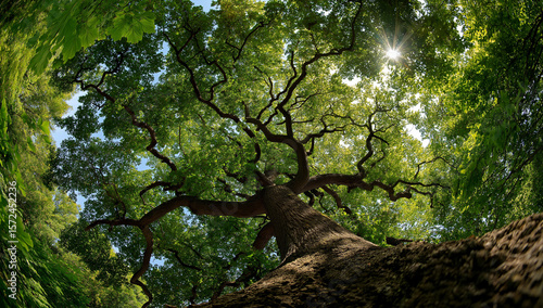 View from Below of a Majestic Tree with Sunlight Filtering Through the Leaves"