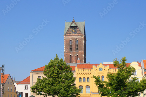 View from market square to the tower from the st. mary's church of hanseatic town Wismar, Germany