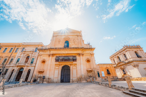 view in Noto, with the Basilica Minore di San Nicolo and Palazzo Ducezio, Sicily, Italy.