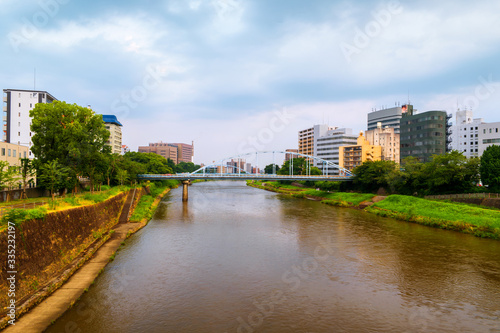 View of a bridge over the Shirakawa river in Kumamoto, Japan