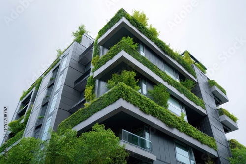 architecture, building, balcony, urban, exterior, facades, city, modern, design, structure, sky, plant, green, growth, view, residential, estate, development, construction, apartment, window, concrete, style, contemporary, home, house, landscape, garden, overcast, tall, perspective, upward, angle, cloudy, complex, steel, metal, grey, leaf