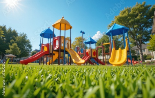 playground, slide, climbing, structure, grass, green, blue, yellow, red, sky, sunny, day, park, recreation, equipment, fun, children, play, area, summer, tree, lawn, landscape, bright, colourful, ground, view, low angle, sunshine